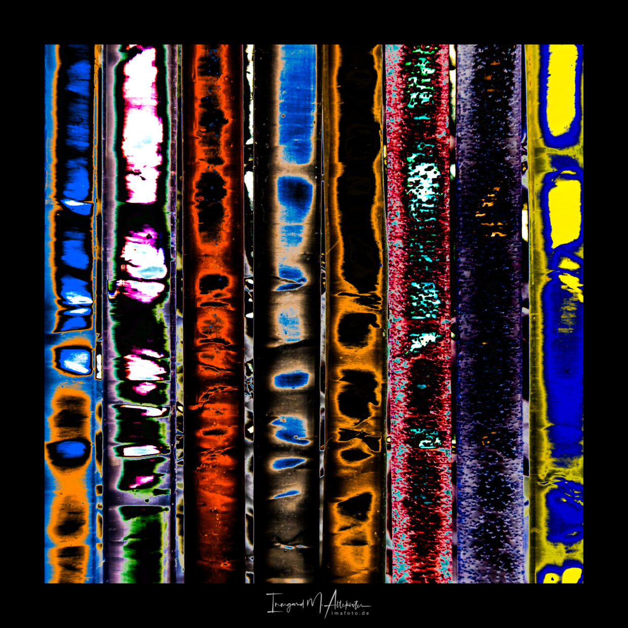 Aus den Fotos der Glasstäbchen ist nun dieses Werk entstanden, in Falschfarben entwickelt.