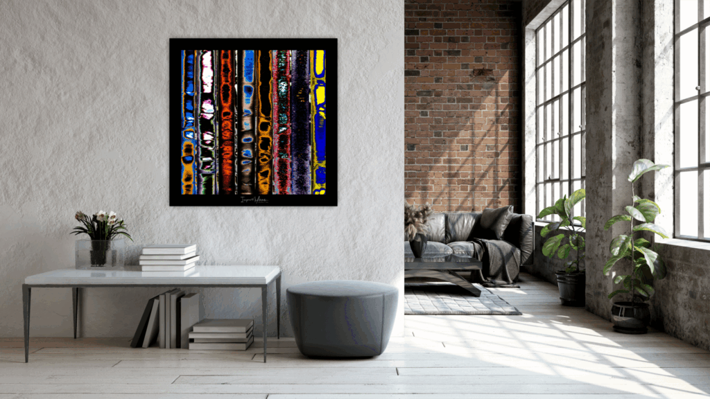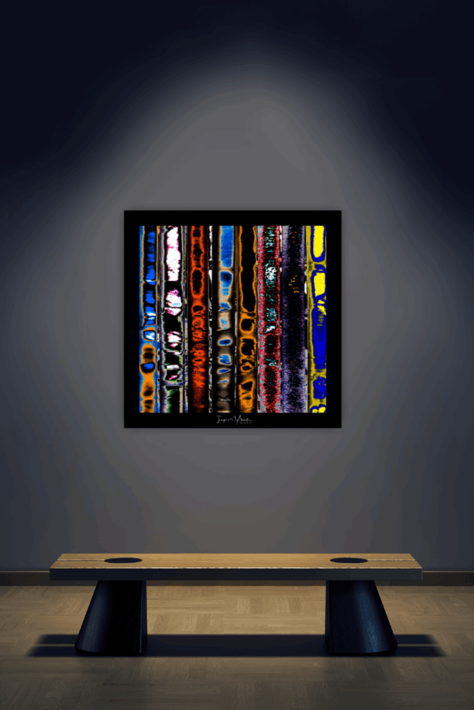 „Vertikale Strukturen, durchbrochen von intensiven Farbexplosionen, verbinden Ordnung und Chaos. Das Werk lädt dazu ein, zwischen architektonischer Strenge und pulsierender Lebendigkeit eigene Assoziationen zu entdecken.“ (ChatGPT)