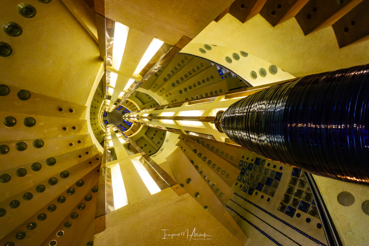 Das berühmte Treppenhaus mit seiner eleganten Wendeltreppe – ein Schlüsselwerk des Art déco in Norddeutschland – führt zum Himmelssaal. Eingelassen in die 89 Stufen, die um eine Mittelachse aus drei himmelwärts strebenden Pfeilern kreisen, sind jeweils acht bierdeckelgroße runde Scheiben aus weißem Glas. Das Geländer ist aus Beton gegossen, durchbrochen wiederum von Glaslinsen. Kaltes Licht fällt durch weiße und blaue Glasbausteine in diesen Treppenturm. (Quelle: Wikipedia)